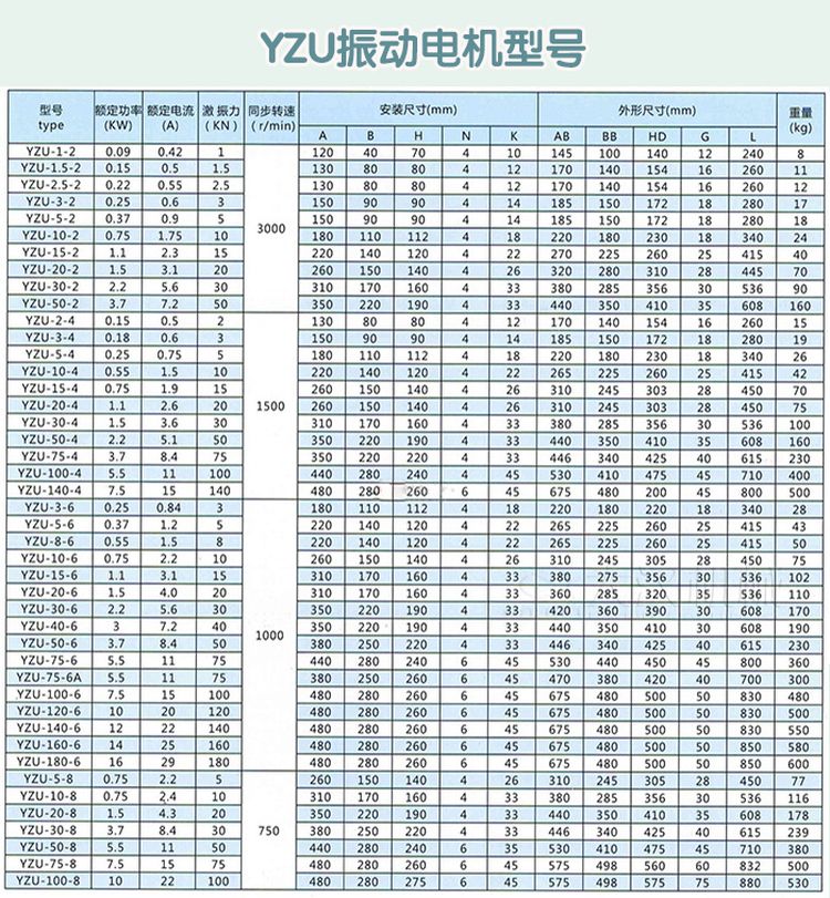 YZUL振動(dòng)電機(jī)技術(shù)參數(shù)表