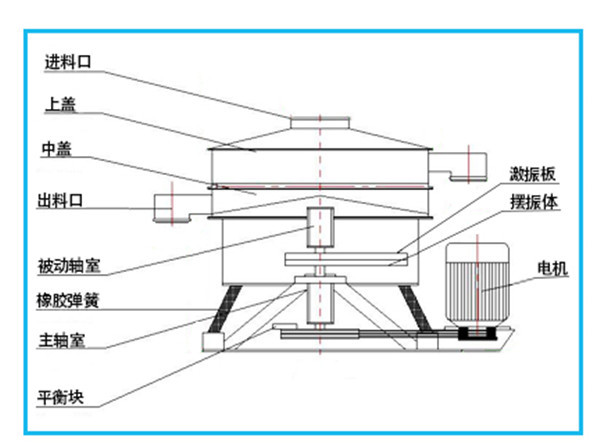 即可調(diào)節(jié)偏心距的激振器產(chǎn)生了非線性三維運動,物料也產(chǎn)生同樣的近似手動作業(yè)的運動,從而達到篩分之目的,
