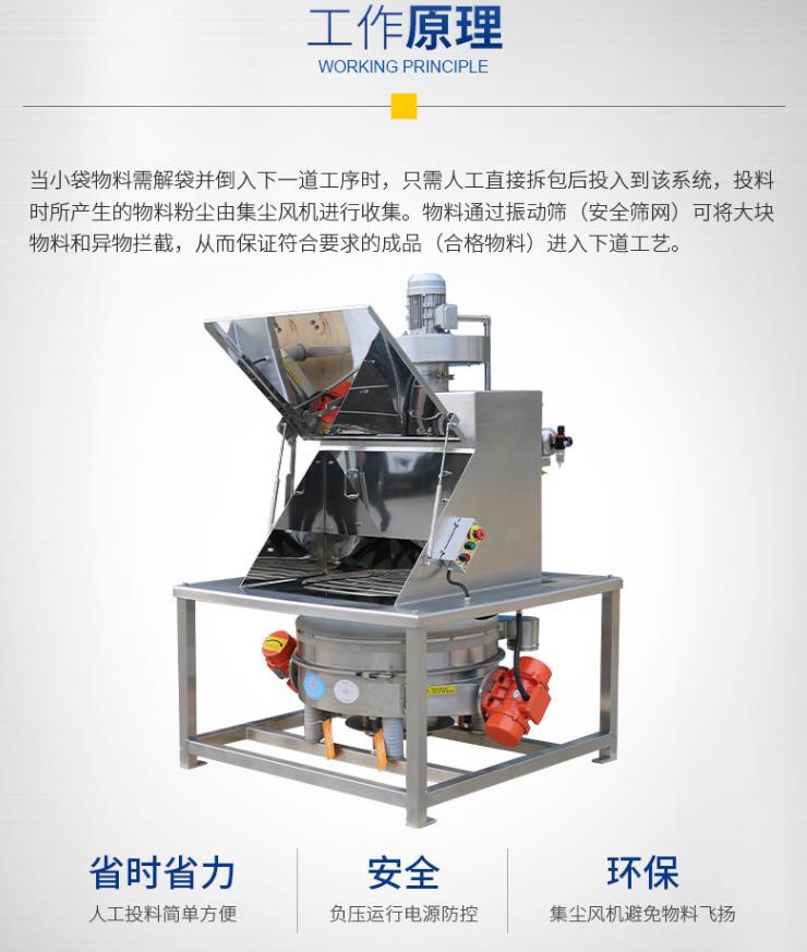 當(dāng)小袋物料需要解袋并倒入下一道工序時,只需人工直接拆包后投入到該系統(tǒng),投料時所產(chǎn)生的物料粉塵由集塵風(fēng)機(jī)進(jìn)行收集。物料通過安全篩網(wǎng)可將大塊物料和異物攔截,從而保證符合要求的顆粒排出。該系統(tǒng)適用于制藥、化工、食品行業(yè)中小袋物的投放、篩分和卸料,特別適用于針對流動性較差物料的投料和篩分,拆包時由于集塵風(fēng)機(jī)的作用,可以避免物料粉塵到處飛揚。