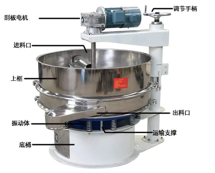 便于加強振動篩篩網(wǎng)的自清潔功能,例 如在面粉篩分中,有些細渣子易于掉落在網(wǎng)孔中,在刮板旋轉(zhuǎn)推動的作用下,
